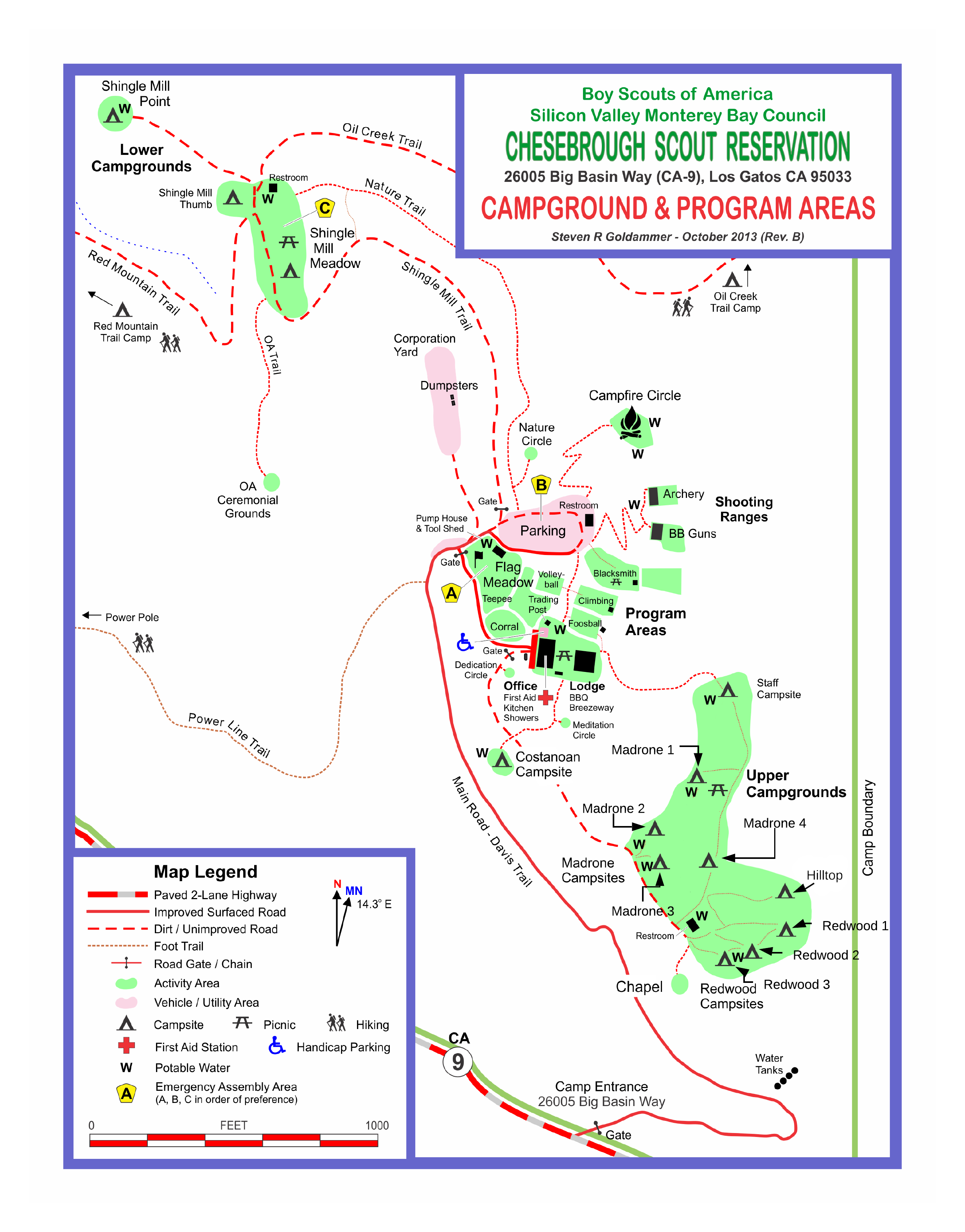 Located in the Santa Cruz Mountains, Camp Chesebrough includes a state-of-the-art training center with a large meeting room for 135 people, commercial kitchen, restrooms, volleyball court, archery and Air-powered BB ranges.